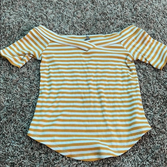 Yellow and white striped shirt. Off the shoulders. Lower in back than in front