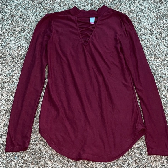 Long sleeve burgundy shirt low cut in front 92% polyester 8% spandex