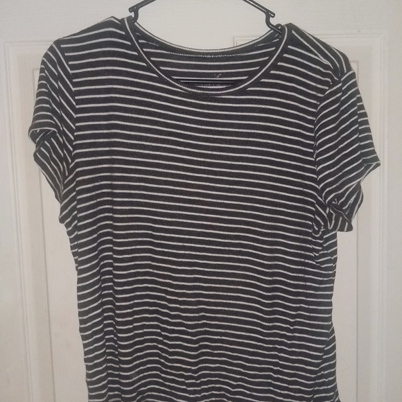 Black and white striped. Short sleeve. Not long but not a crop top.