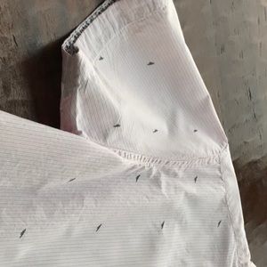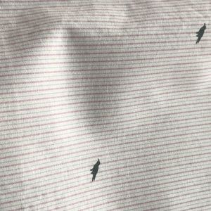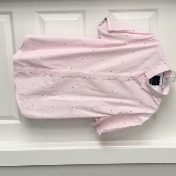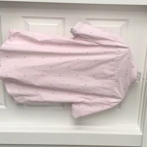 Pink and white vertical stripe with tiny birds. Wear alone or over a tank top. Short sleeve.