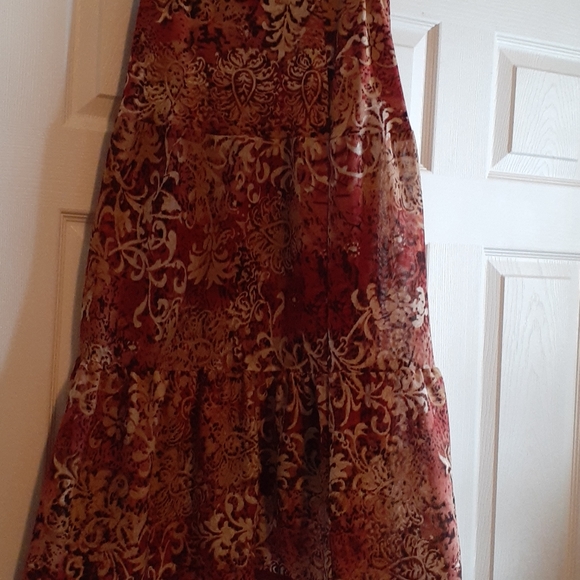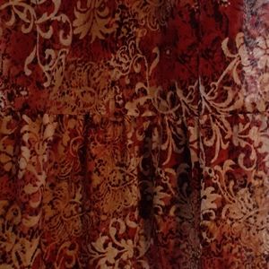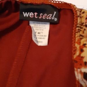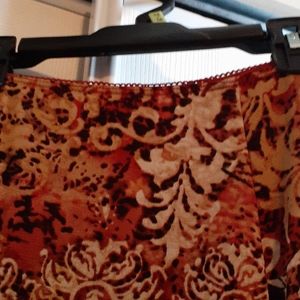 Orange and multi color shirt, nylon material, riffle bottom.