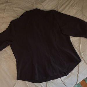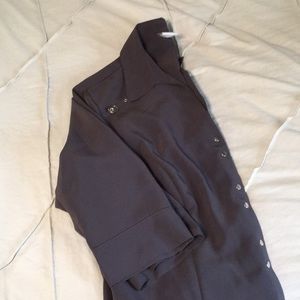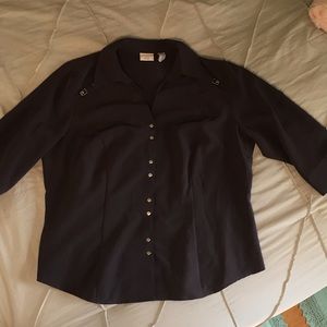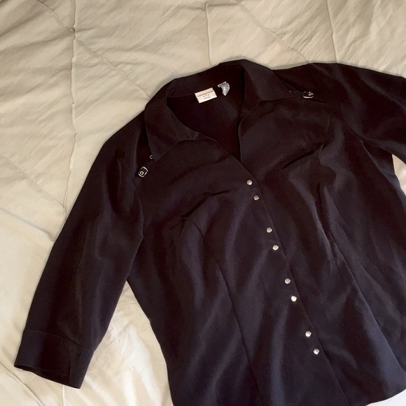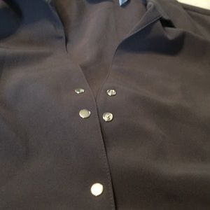 Dark grey women’s shirt. Material is nice, cool, smooth. Buttons are a silver metallic, no scratches. You can dress up or go casual in this nice dark grey shirt.