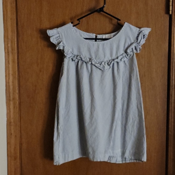 Gray and white strip sleevless shirt with cute ruffle below neck
