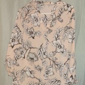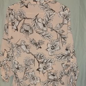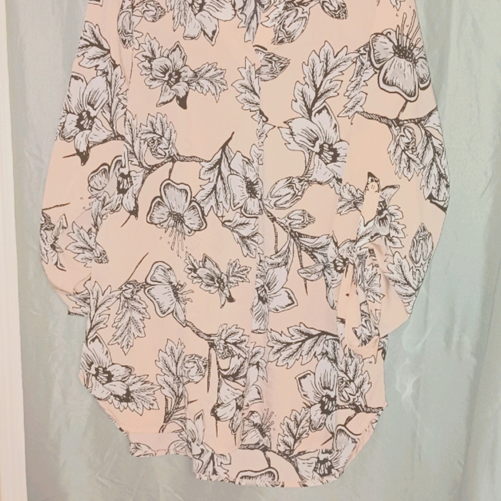 ADORABLE pale pink with black and white flowers. "V" neck, mid length sleeves that can be unbuttoned to wear at full length. It's slightly longer in the back so prefect to wear with black tights.