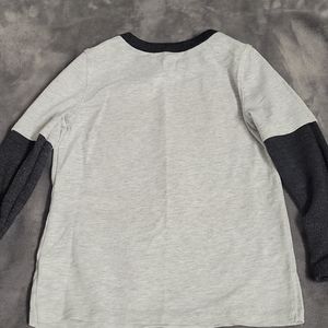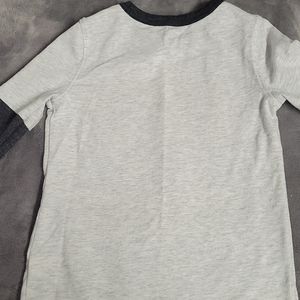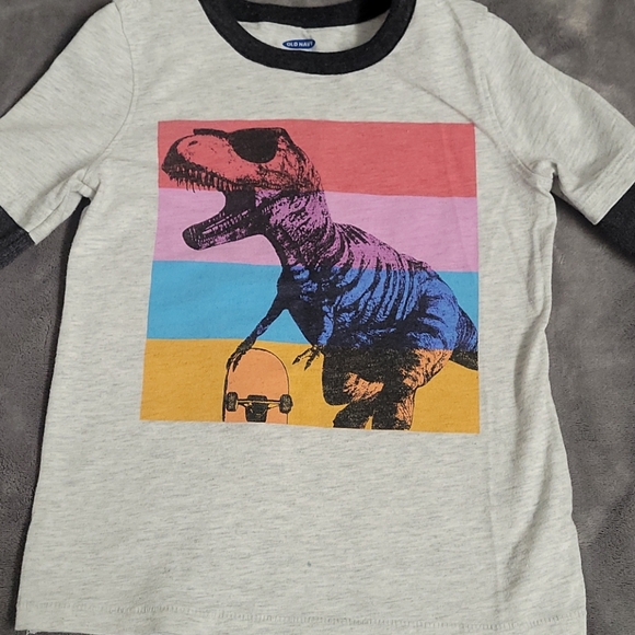 Gray Shirt , has a dinosaur with multi colors .