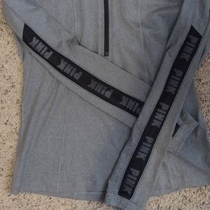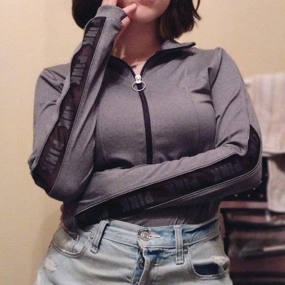 Long sleeved gray Victoria's Secret Pink sweatshirt with a zipper and collar. Sleek, tight-fitting and very comfy. It has strips of sick mesh detailing down the sleeves. Size S