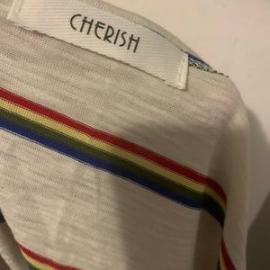 Dolman sleeve top with knot in front, v-neck, rainbow on top and dark blue on bottom. Loose fit.