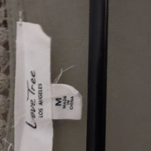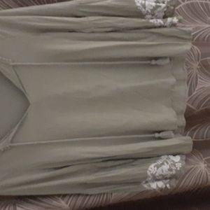 So cute!! Perfect for casual dress. Also, can dress it up. Light material.Olive green with lace on sleeves and tassels. V neck.