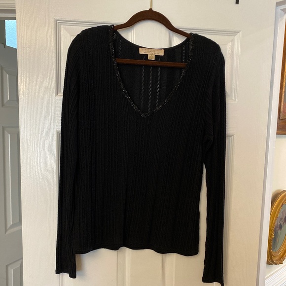 This is a knit shirt and it also has some sparkles. It is in very good condition. It is also 100% silk.