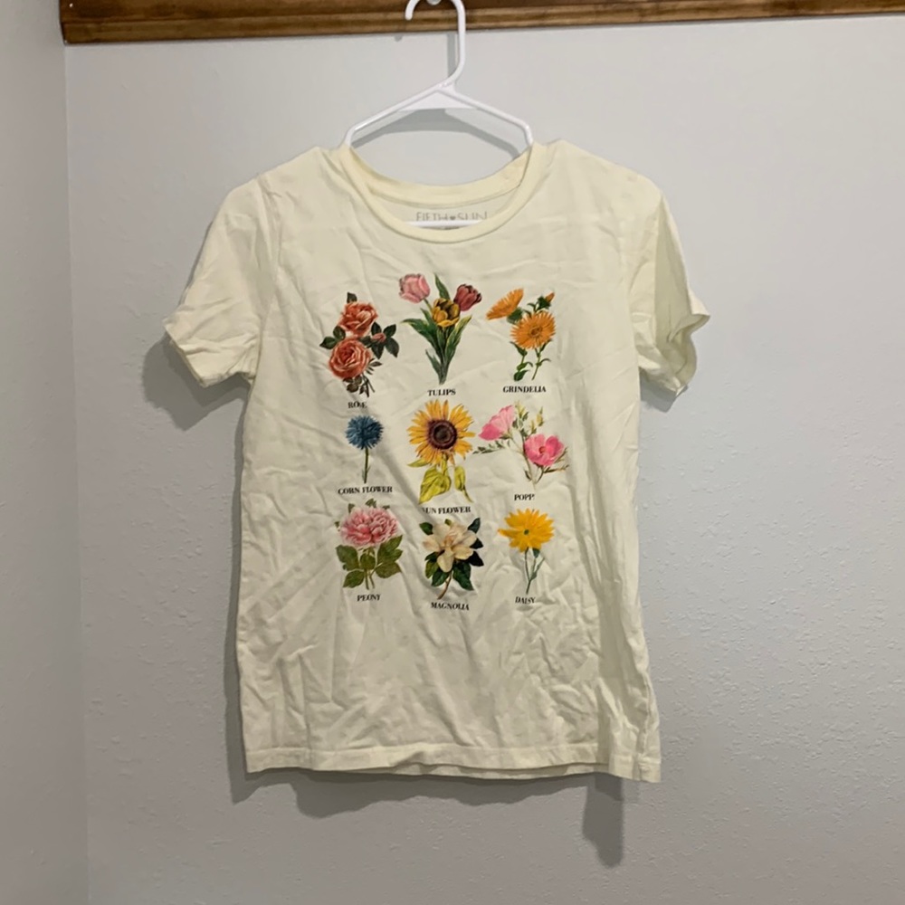 Fifth sun flower t-shirt. Size L but shrunk. I would say it’s a size sm/m
