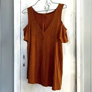 This is a beautiful stripped shirt. It shows you’re shoulders and has strings in the front for accessory. It’s orange and flowing.
