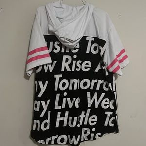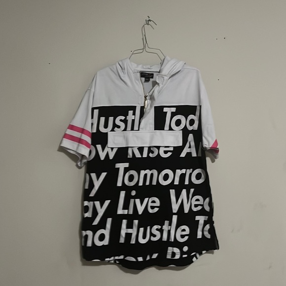 A white, pink, and black shirt with words and a gold zipper in the front and a hood