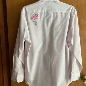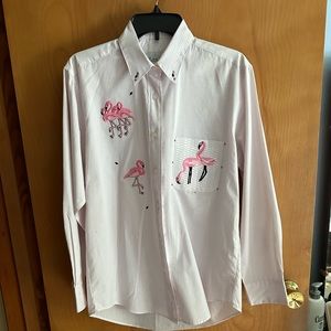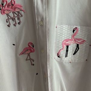 Long sleeve button cuffs. Front button . Excellent condition. Size small but is oversized. More like large.