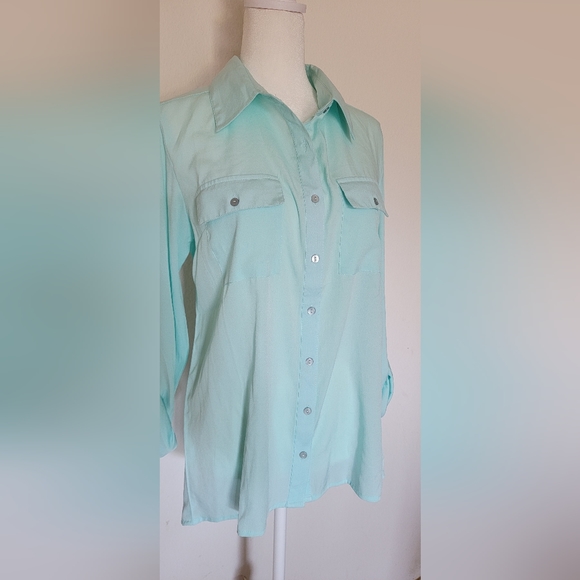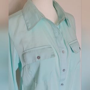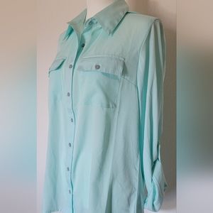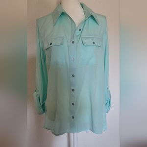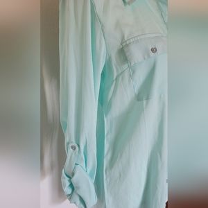 Pretty.. light blue, almost a bit of a mint color button down shirt. light weight and feminine. size M (#2)