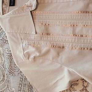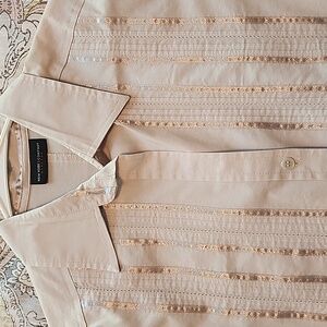 The shirt is streamlined with beautiful shiny taupe pinstripes in the front. Can be worn in the office or casual. Looks great with jeans, skirts, pants, or shorts