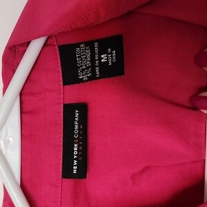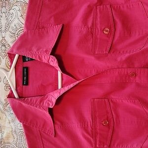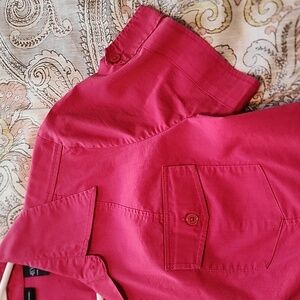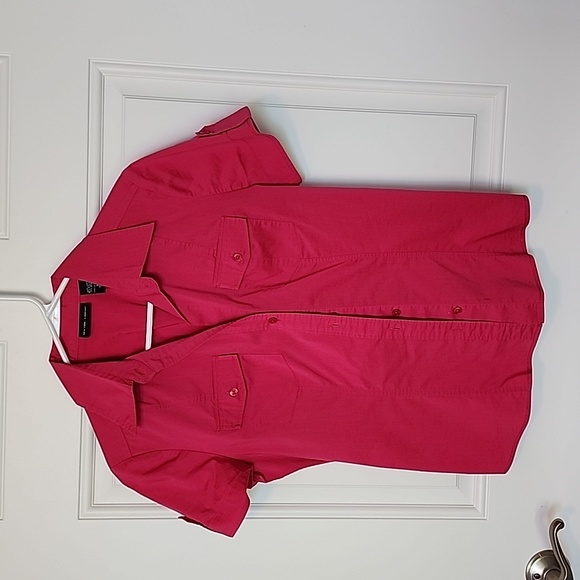 Good Condition Button down dress shirt. Beautiful Fushia color. Cap sleeves with button. Looks great with jeans, pants, shorts, or a skirt.