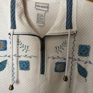 This is a long sleeved light weight shirt. Has embroidery in the front of shirt with zipper closure. Material of cotton and Polyester. Machine washable and dryable. Shirt is 29 inches from shoulder to hem. Has notched hem.