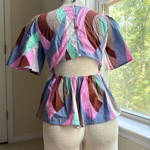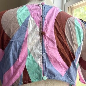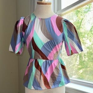 Add a pop of color to your wardrobe with this vibrant women's top. Featuring a playful mix of pink, blue, green, and brown, this top is perfect for any occasion. The puff sleeves add a touch of elegance and style.