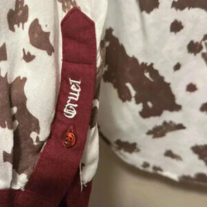 Cruel girl, denim shirt. Maroon and cow print western style with pearl snaps at the sleeves. Worn once for an appearance, excellent condition. Size extra small but would fit up to a medium. The pictures of my daughter are a true fit and she wears a medium.