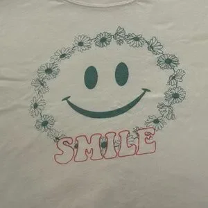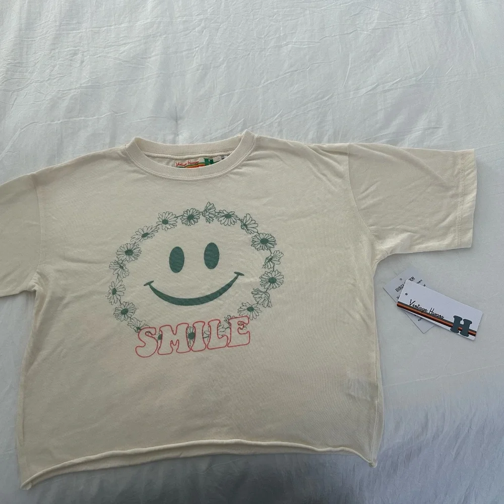 Ultra soft t-shirt from Vintage Havana featuring short sleeves, round neckline, and a happy face on front.
