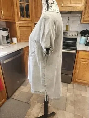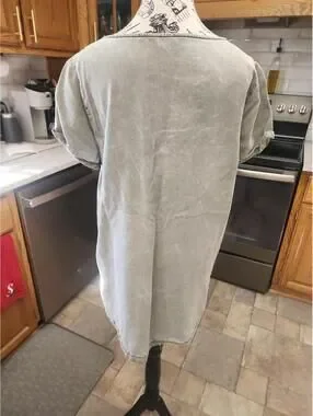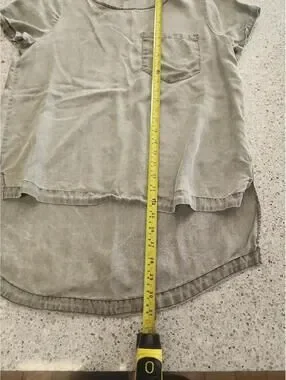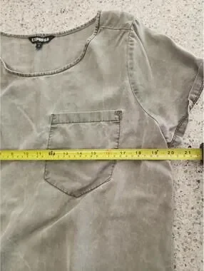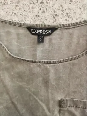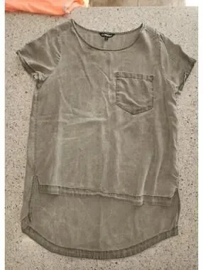 Express short sleeve shirt. Size medium. ZERO STRETCH fabric. But very soft almost suede feel. Longer length in the back like tunic length. 24in long in the front. Front pocket.
