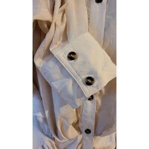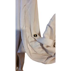 Shirting, but make it cool. Done in lightweight polyester to feel like silk in a modern cream hue, this isn't your average shirt dress. The classic tailored silhouette gets a relaxed spin courtesy of effortless draping, a waist-cinching tie belt and rolled sleeves. Wear the sleeves down with the cuff or rolled up; your choice. Nice touch with the tortoise shell colored buttons. Appropriately Ruched to hide bumps or lumps. Pair with block-heel booties and you're ready to go. Also pairs nicely with a Summer tan or tanning lotion. NOTE: The picture of the gray dress is to just show you the style on someone, it is the same style but different material. 83% of the reviews say they would recommend this dress to someone else. Retail $60 NEVER BEEN WORN