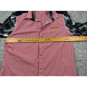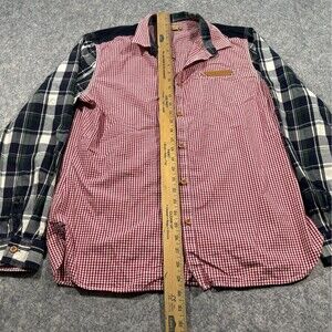 Shirt Womens Button Mixed Media Blouse Top Plaid Patchwork Blue Green Sz XXL