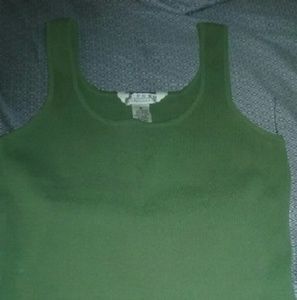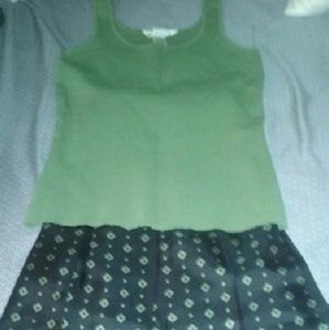Beautiful sweater like tank that's a nice olive green color. With a matching skirt I'm 5'2 and it comes a little below my knees. The shirt is65% rayon 35% nylon its a size medium. The skirt is 100% silk its a size 10 and black with olive green designs on it.. Beautiful set I never have a chance to wear them I have so much I downsizing.. Please ask any questions and thanks for stopping by..