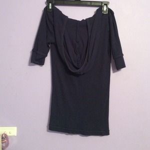 Dark navy blue and it has a hood. No stains or holes that I know of and there shouldn't be any because I've never worn this and if you have any questions just leave a comment(: