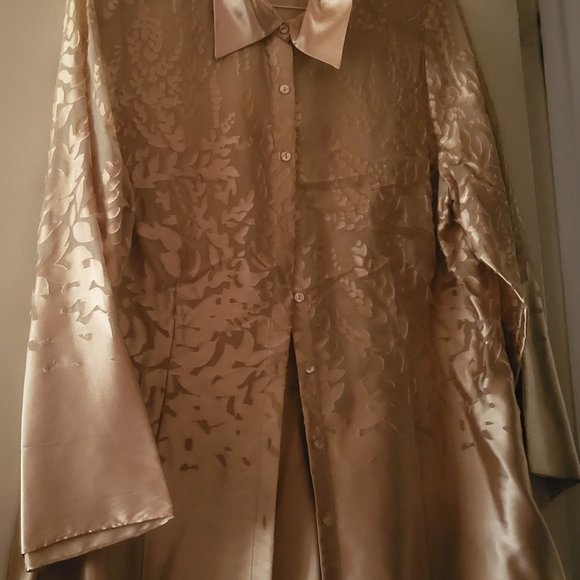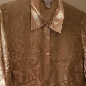 Shirt/Blouse size 14/16, partially sheer-Rayon and silk. Long sleeves flare at bottom.
