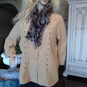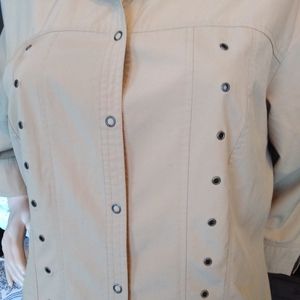 Peach skin snap front shirt with grommets down each side. 3/4 sleeves with cuff and slit. Very versitile. Euc. Faux snakeskin handbag also listed in my closet.