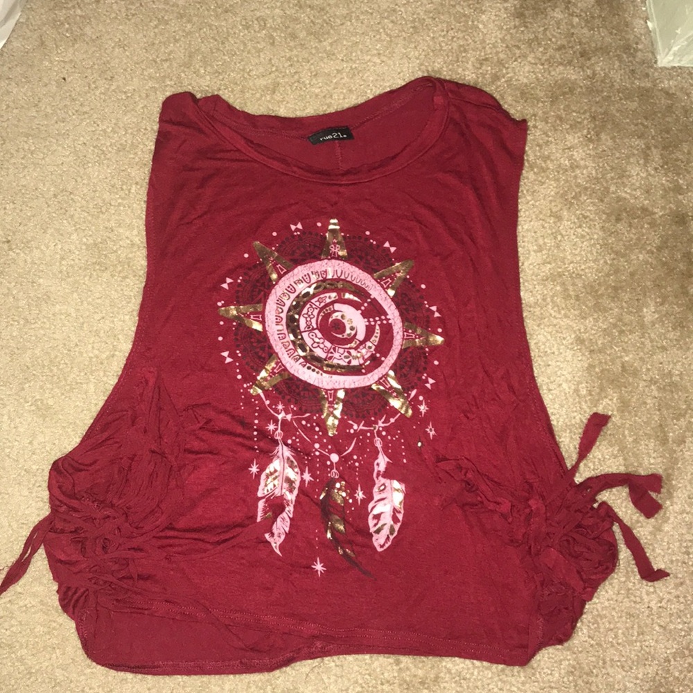 Two shirts for the price of one! The first shirt is a tank top, very lightweight material & has fringe at the ends of each side.