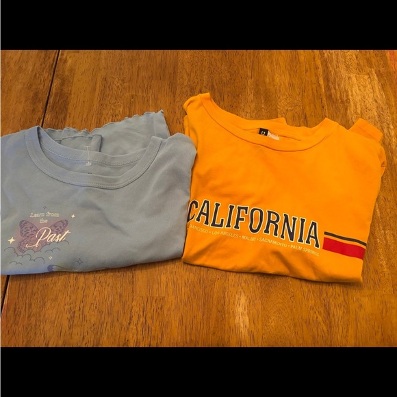 2 cropped young adult or teen shirts. Size large. I don’t believe either were ever even worn. No stains. No tears. No flaws.
