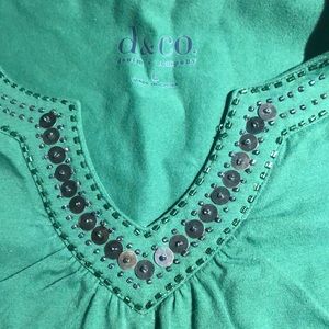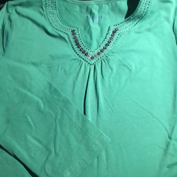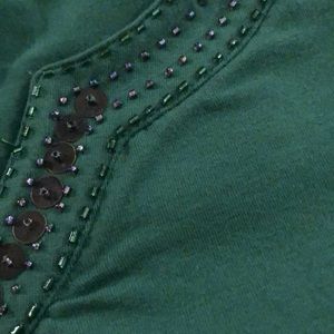 Awesome color top with 3/4 length sleeve. The color is like a leaf color Beautiful embellishments around the neck