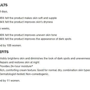 Visibly brightens skin and diminishes the look of dark spots and unevenness.