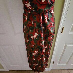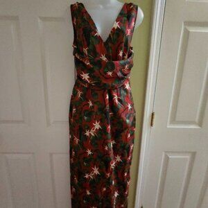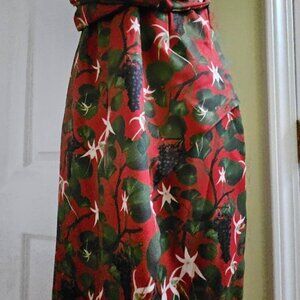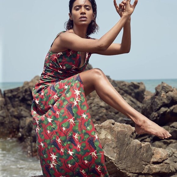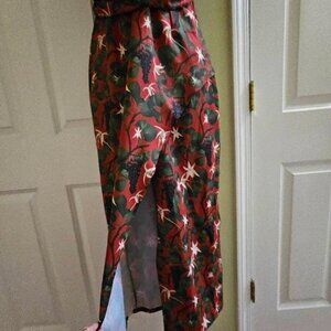 Shivan & Narresh X Koovs Indian Lush Vineyard Maxi Dress Medium - limited collaboration capsule collection from 2019. Featured in India Vogue, Vogue India. Designer luxury dress. Special collab. Translates the Red Dahlia skims with the Lush Vineyard print. Summer print with juicy grapevines. Duo first non swimwear collection. Maxi length with a slit up the front, plunging v-neck, hidden zipper on the side. Open top of the back with criss cross traps and a keyhole cut out. Red with gorgeous vineyard print all over with purple grapes, green leaves and branches, and white/yellow flowers. Perfect for spring and summer. Lightweight and breezy. 100% polyester. Made in India. Has vibes similar to Betsey Johnson fruit dresses. Resort wear.
