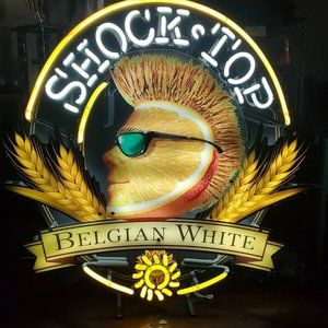 Desung 24"x20" LIKE NEW! Shock Top Belgian White Neon Sign for any home Beer Bar, Man Cave, Business Office This Neon Sign uses unique HD VIVID PRINTING Technology! The neon sign is mounted on the metal frame and can stand or hang on a wall. Measures: Metal Frame size is 20 Inches. (Neon tube size is a little smaller than that, depend on the shape of the neon sign). Input voltage: 110V-240V. 100% hand-made, true hand-bend, gas-filled,real glass tube neon sign!