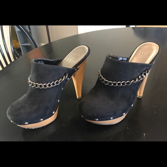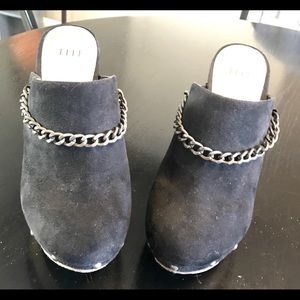 ELLE black suede open back high heel with black and silver chain which hangs on front of shoe. Worn a few times snd in great shape