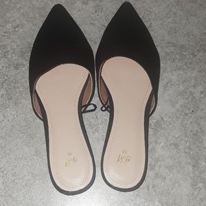 Black satin flat slides in EUC, they do not fit me 😪 I purchased them from this site, size 8, I wear a size 7.5 but almost always purchase a size 8 however my heels hang off the backs of these shoes.