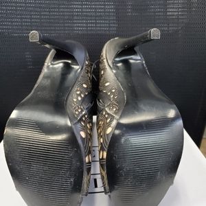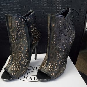 Preowned gently used Steve Madden fashionable and stylish peep toe ankle bootie. This sexy gorgeous leather 3.5 inch anklet will surely accentuate any outfit. Corset tieup in back of shoe.