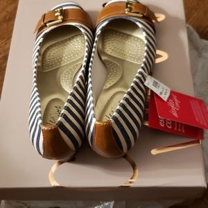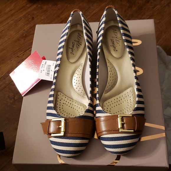 Navy and white stripe shoe with brown buckle in front and a strip on back