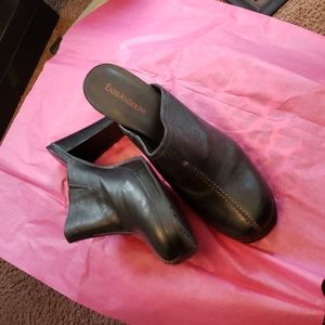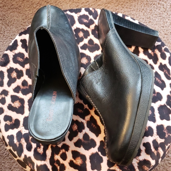 Enzo Angioloni Black shoe Size 8.5 Medium, Leather Upper, Round toe, stacked heel measure 3 1/2 inches, show no visible signs of wear.