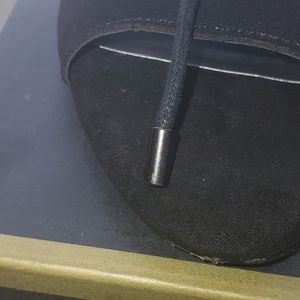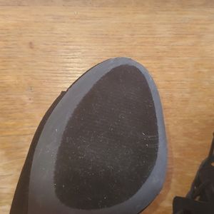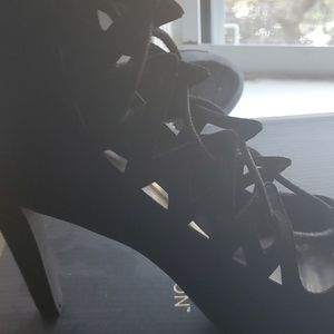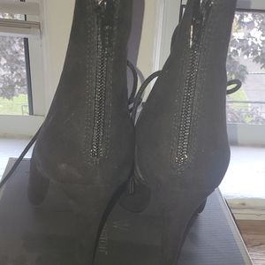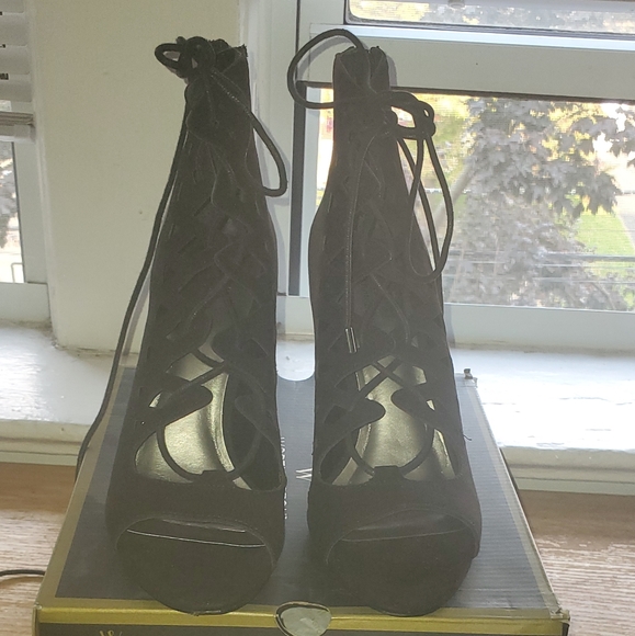Black open toe suede tie up heels, zipper im back of shoes, heel 3 inches. Never worn but tiny scuff on 1 shoe but not noticeable. See pic