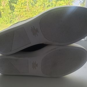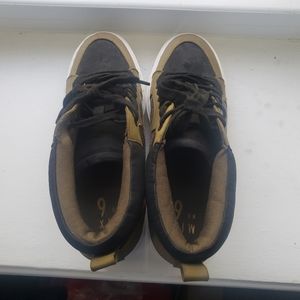 Nice new shoes without box, 9.5 M never worn. The length is between 2.5 and 3 inches tall. It is a bootie wedge sneaker-like type of shoe. It is not leather. Ask all questions you have before purchasing.