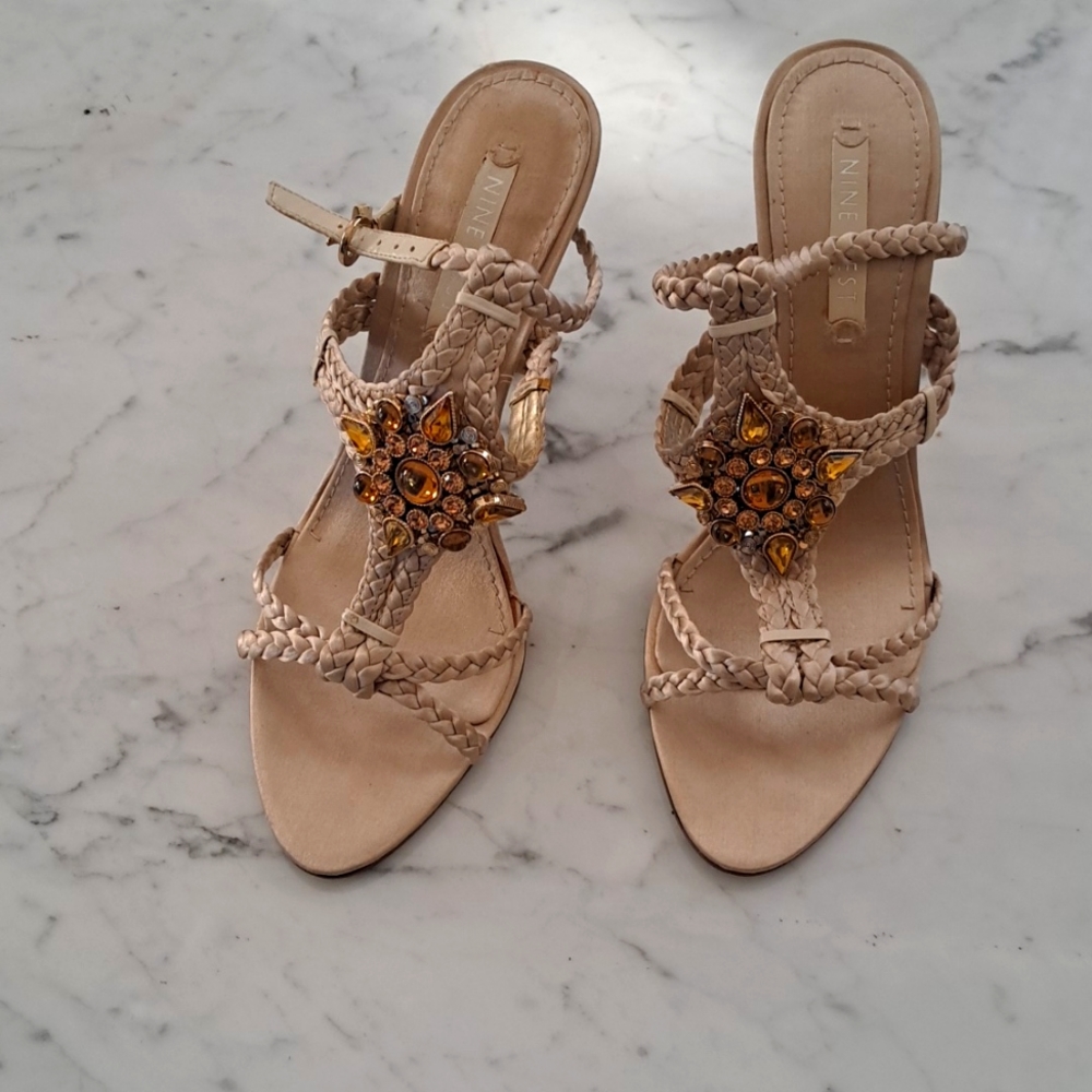 Beautiful silk like material dress shoe with the rhinestone details on the front. Has some marks on the heel. Heel high 3".