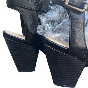FEATURES/ACCENTS: Ankle style. Low block heel. Open toe. Black color. Buckle Closure