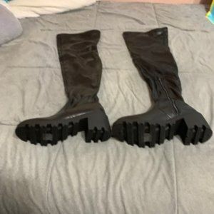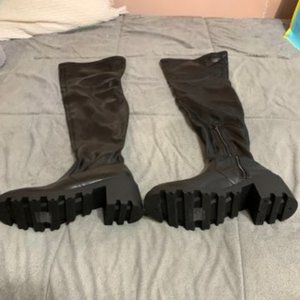 JustFab Jordane Lug Sole Over-the-Knee Boots for Women - Black Thigh High Boots, Faux Leather Chunky Heel Boots