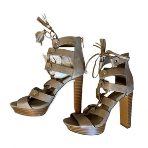 Shoe Dazzle NEW Johany Stacked Heel Platform Sandal Strappy Taupe Women’s 5.5