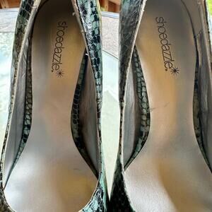 Shoe Dazzle PEYTON Heels Women SZ 7 Green Snake Animal Print Platform Stilettos