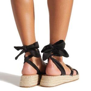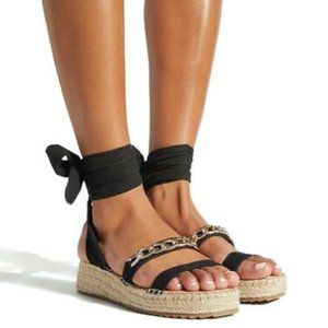 A flatform espadrille sandal featuring a chain detail and versatile wraparound ankle ties, Double the Padding For Comfort Support and Ease of Movement